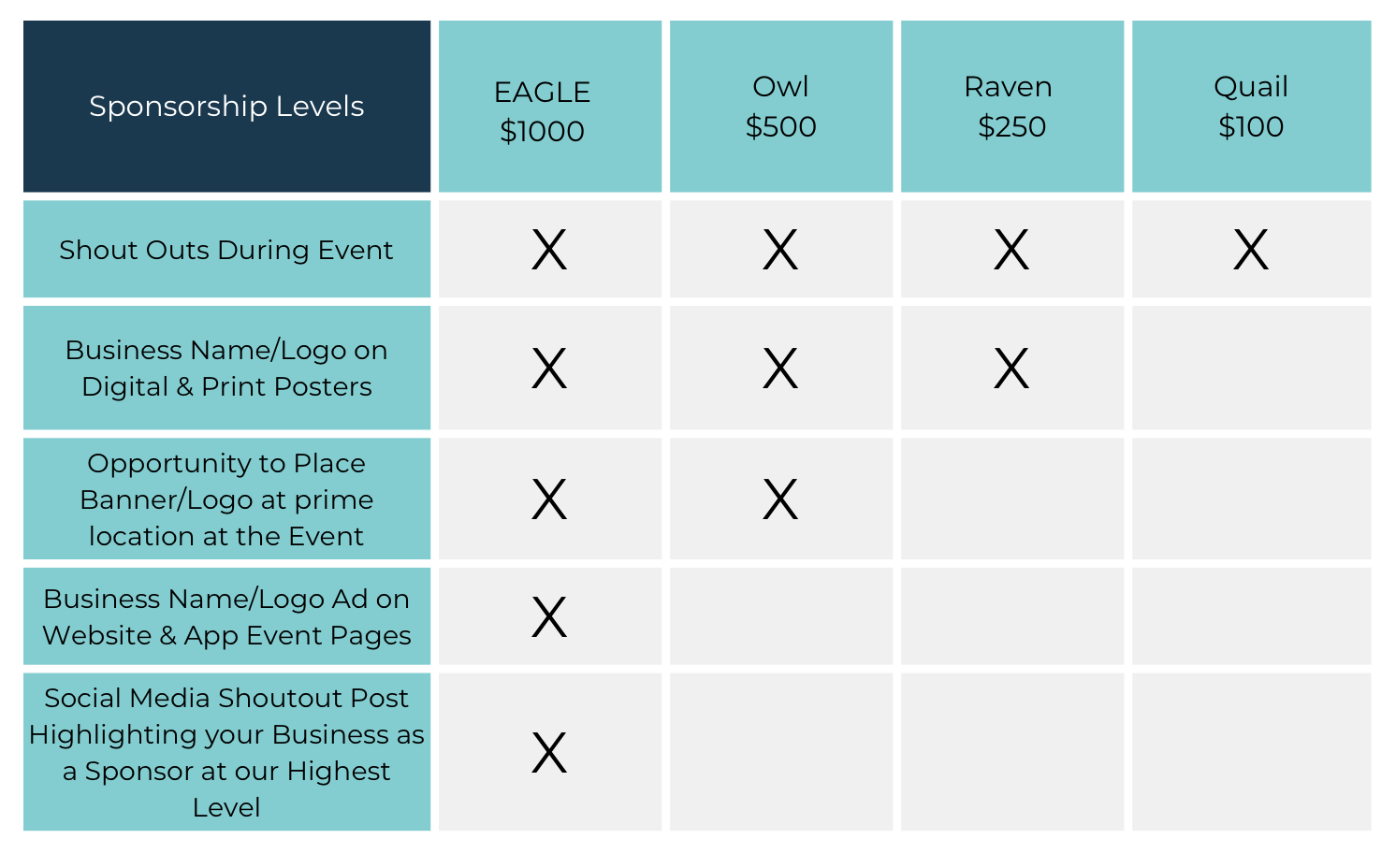 Event sponsorship levels are per event. Please indicate which event(s) you’d like to sponsor, or we will randomly assign one.